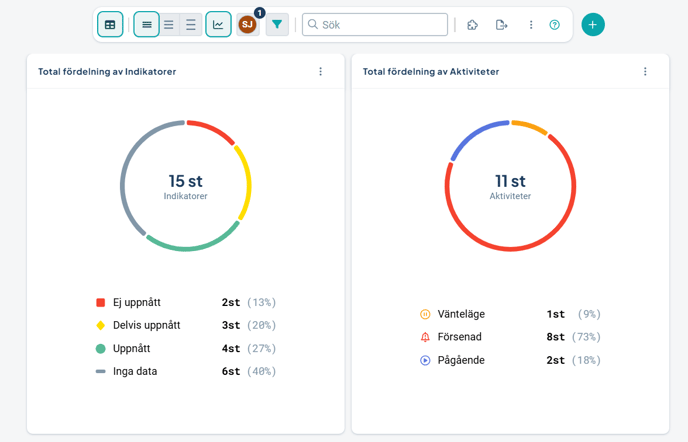 I nya vytypen kan du använda vygadgeten "Total fördelning" för att se fördelning av färg och status för mål, mått och aktiviteter.