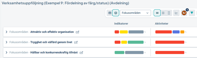 Ett annat alternativ är att skapa en gruppering och lägga till fördelningsstaplar som översiktselement. Då kan du se färg och status per område för dina mått och aktiviteter.