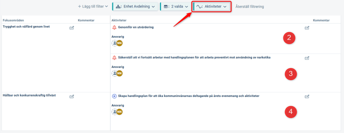 I bildexemplet vill vi inte visa raderna 1 och 5 då dessa saknar kopplade aktiviteter: