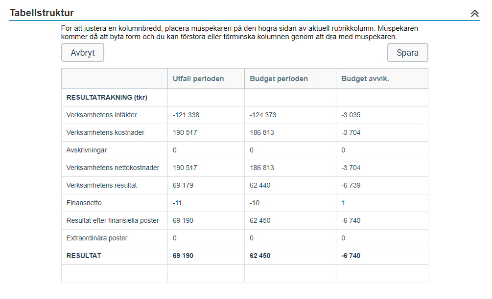 Och justera kolumnbredden på tabellens kolumner genom att klicka på kolumnens kant och dra den till den storlek ni önskar. Upprepa för samtliga kolumner som ni önskar justera och klicka därefter på Spara.