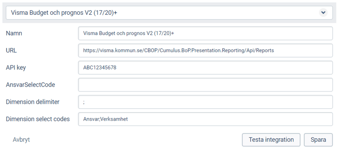 Välj Visma Budget och prognos V2 (17/20)+ i drop-down listan och fyll i följande parametrar som ni får av er Vismakonsult i samband med uppstart: