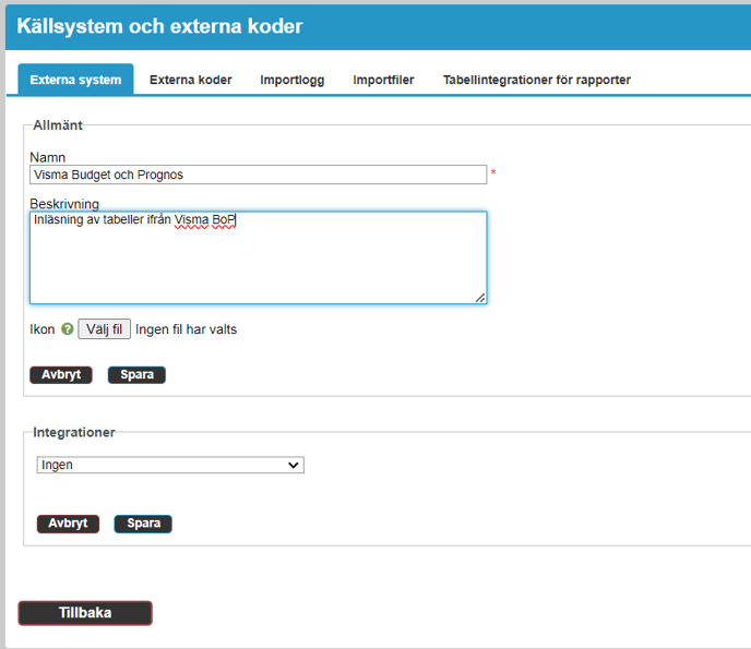 Skapa ett källsystem under fliken Externa system genom att klicka på Lägg till. Skriv valfritt namn, förslagsvis Visma BoP och lägg till en beskrivning och ikon om så önskas. Klicka därefter på Spara.