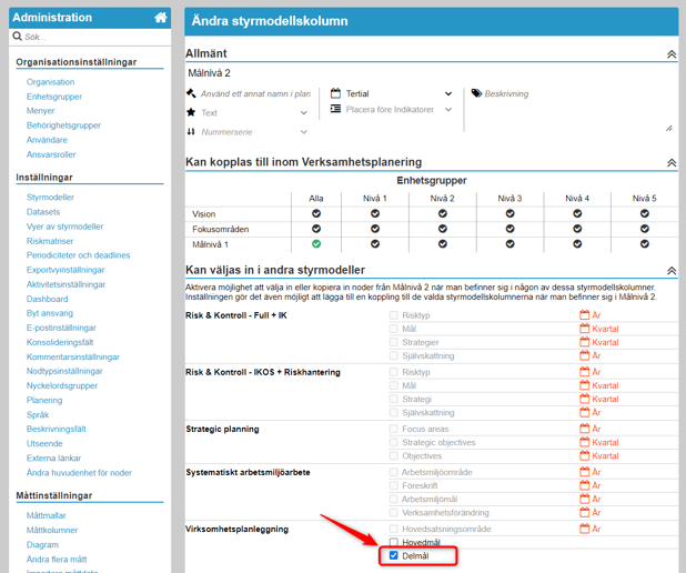 I bildexemplet tillåter vi inval från textnoden "Målnivå 2" från Verksamhetsplanering till textnoden "Delmål" i styrmodellen "Virksomhetsplanleggning". Bägge har periodicitet "Tertial". Spara och stäng.