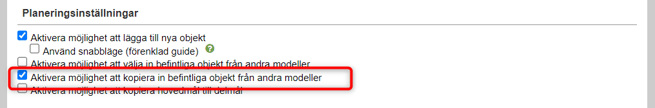 Exempel: Under planeringsinställningar, klicka i "Aktivera möjlighet att kopiera in befintliga objekt från andra modeller" och spara.