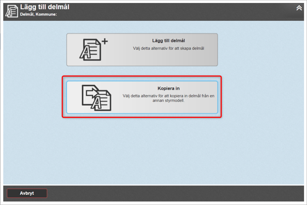 Standard är att det går att välja in från andra styrmodeller och produkter. För att göra det möjligt att välja- eller kopiera in objekt från styrmodellen som användaren befinner sig i måste det aktiveras i den aktuella styrmodellen man väljer- eller kopierar in till.