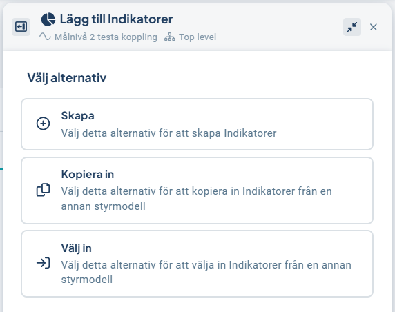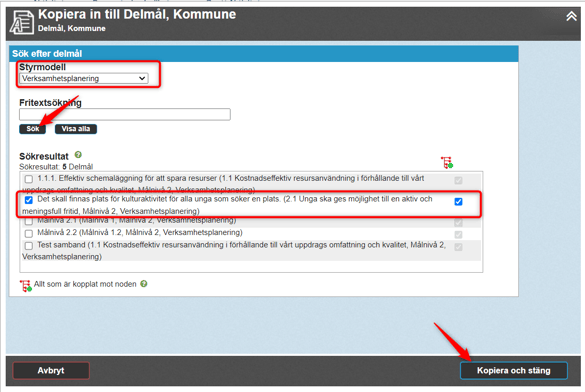 När du kopierar från samma styrmodell får du en ny kopia av alla noder i kedjan. Detta kan vara användbart om du till exempel vill skapa ett liknande mål med samma typ mått och aktiviteter som du redan har.
