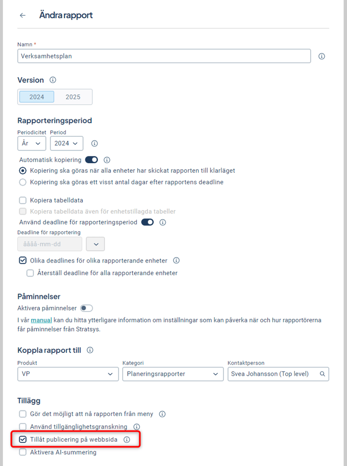Kryssa i "Tillåt publicering på webbsida" som hittas under rubriken "Tillägg", för att markera rapporten som tillgänglig i webbpubliceringen.