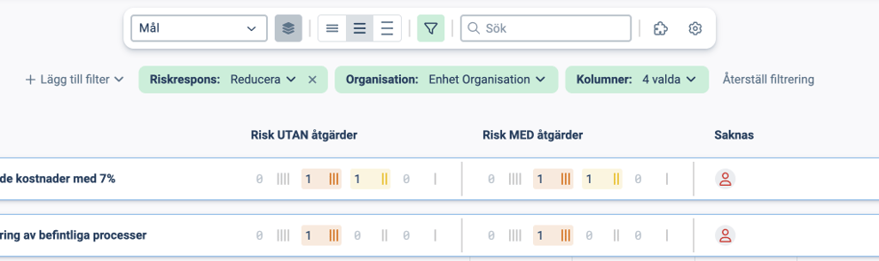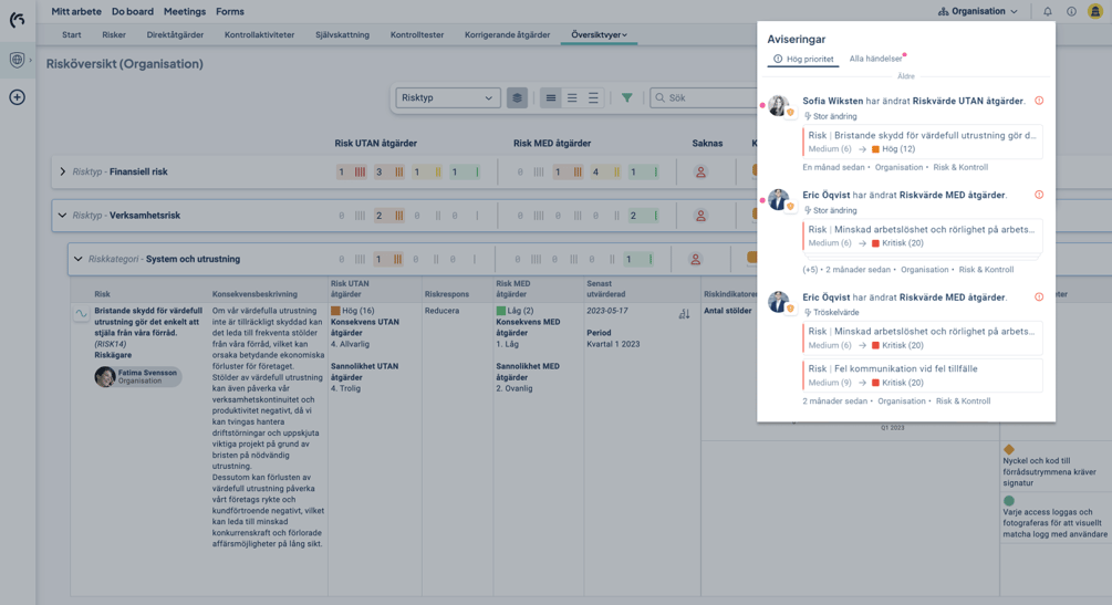 Vi har tagit fram en moderniserad och enklare översikt som hjälper dig att snabbt och enkelt se vad du behöver agera på. Även arbetsflödet och navigationen har optimerats där en stor fördel för dig som användare är att du får en komplett överblick av riskarbetet i en och samma arbetsyta, och inte behöver växla mellan olika vyer i plattformen.