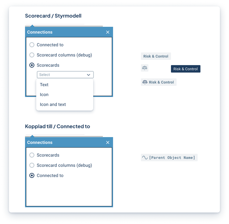 Med "styrmodeller" kan du visa i vilken/vilka styrmodeller objektet finns i, med flera visualiseringsmöjligheter. Med "Kopplad till" kan du visualisera namnet på objektets närmsta koppling.